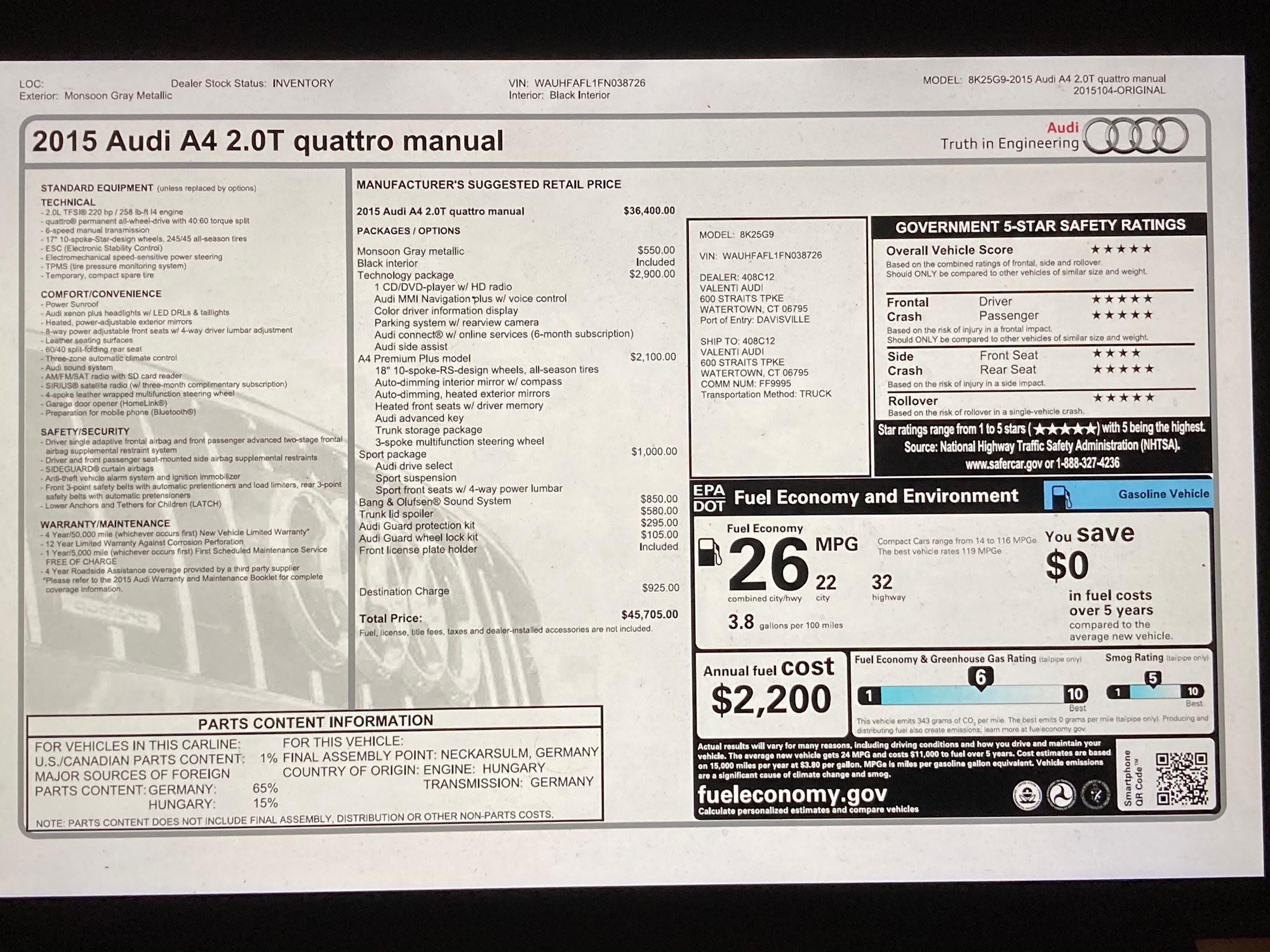 2015 Make: Audi Model: A4 Body type: Sedan Doors: 4 doors Drivetrain: All-Wheel Drive Engine: 220 hp 2L I4 Exterior color: Black Combined gas mileage: 27 MPG Fuel type: Gasoline Interior color: Gray Transmission: 6-Speed Manual Mileage: 98,118 NHTSA overall safety rating: 5 Stock number: 5884 VIN: WAUHFAFL1FN015138