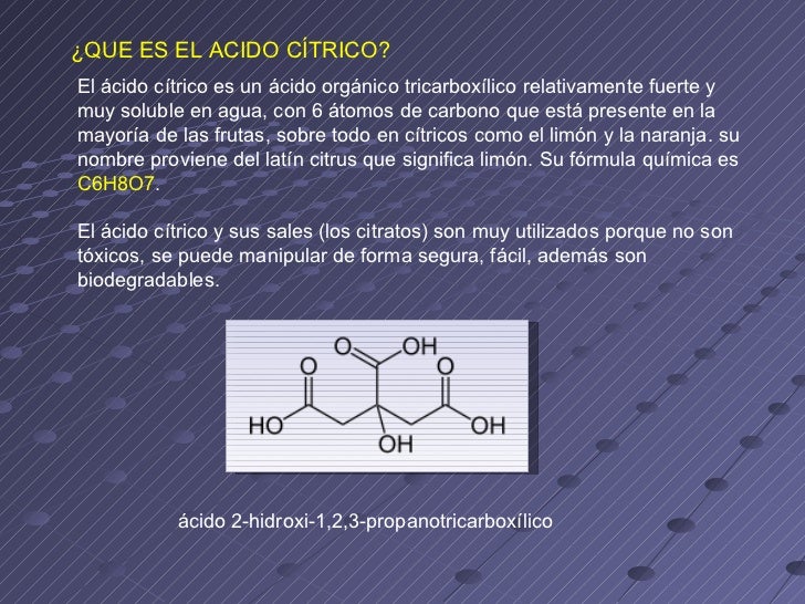 Tema: Los usos y aplicaciones principales del ácido cítrico. El ácido cítrico es un ácido orgánico tricarboxílico que está presente en la mayoría de las frutas, sobre todo en cítricos como el limón y la naranja. Su fórmula química es C6H8O7. Es un buen conservante y antioxidante natural que se añade industrialmente como aditivo en.