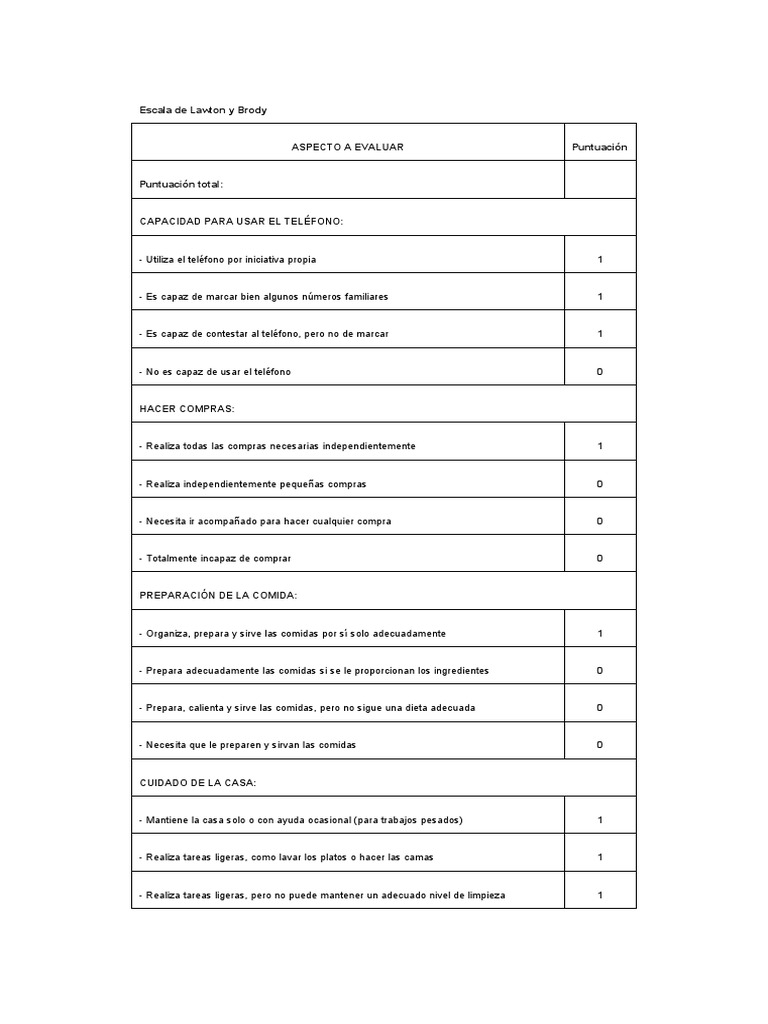 Escala de Lawton y Brody (1) (1) Escala de Lawton y Brody ASPECTO A EVALUAR Puntuación