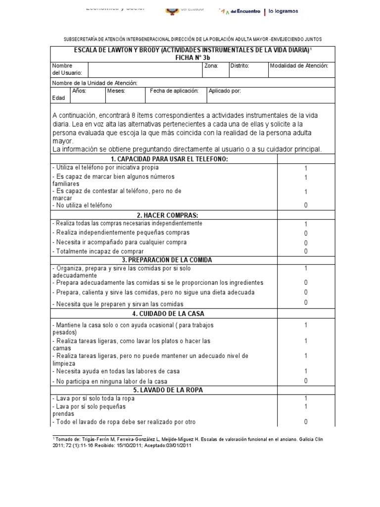 1 Tomado de: Trigás -Ferrín M, Ferreira González L, Meijide Míguez H. Escalas de valoración funcional en el anciano. Galicia Clin 2011; 72 (1):11-16 Recibido: 15/10/2011; Aceptado:03/01/2011 ESCALA DE LAWTON Y BRODY (ACTIVIDADES INSTRUMENTALES DE LA VIDA DIARIA)1 FICHA N° 3b Nombre del Usuario: Zona: Distrito: Modalidad de Atención: