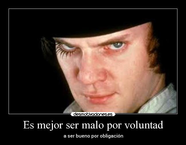 Frases de "La naranja mecánica" 5 citas. "¿Qué quiere Dios? ¿El bien o que uno elija el camino del bien? Quizás el hombre que elige el mal es en cierto modo mejor que aquel a quien se le impone el bien.". "La bondad es algo que uno elige. Cuando un hombre no puede elegir, deja de ser hombre.". "Es la cobardía innata del.