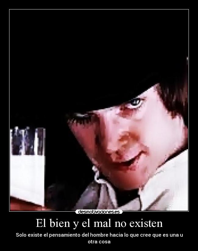 Una naranja mecánica cita de la película y la novela sobre el bien y el mal. 1. "Si solo puede realizar el bien o solo el mal, entonces es una naranja mecánica, lo que significa que tiene la apariencia de un organismo encantador con color y jugo, pero de hecho es solo un juguete mecánico al que darle cuerda.Dios o el diablo ". 2. "Veo.