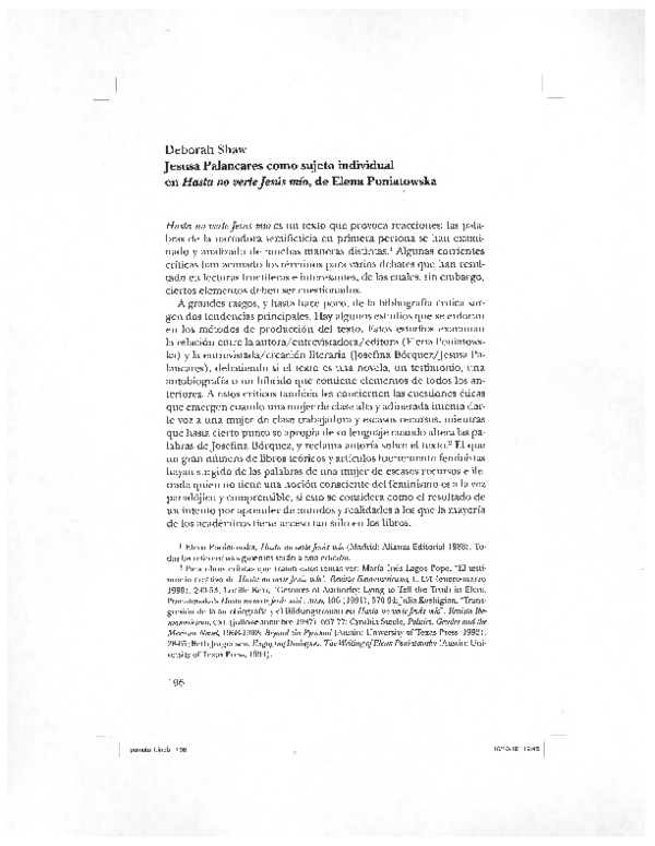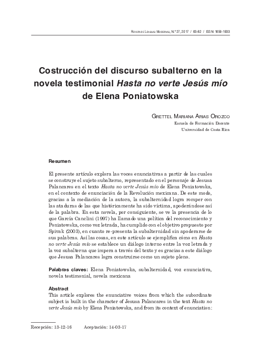 (PDF) Jesusa Palancares as Individual Subject in Elena Poniatowska's" Hasta no verte Jesús mío