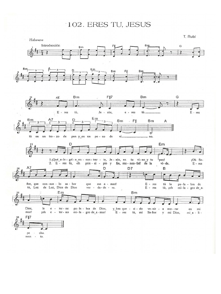 eres tú en un trozo de pan y en un poco de vi . . . no. 1-. Que alegría encontrarte Jesús, en tu vino y tu pan, oh! Señor que consuelo saber que me amas, eres tú la palabra de Dios, la eterna palabra de Dios, que has querido venir a morar en mi pecho. 2-. Eres tú, oh principio y Fin, manantial de la vida,