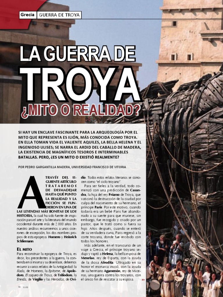 La guerra de Troya es uno de los conflictos bélicos más importantes y también de los más rodeados de mitos y leyendas y punto de partida de la Ilíada de Homero. Si bien es sabido que Homero parte de acontecimientos relaes, hay una polémica que periódicamente va resurgiendo ¿cuánto hay de cierto en el relato homérico?, ¿de dónde surge la idead de un caballo invasor o la del famoso.