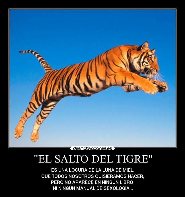 El salto del tigre es una legendaria fantasía sexual que proviene, para el desconcierto de muchos, de una famosa obra de William Shakespeare. El "salto del tigre" es una curiosa práctica sexual que es considerada una fantasía a la hora de la intimidad. Consiste en que, en pleno acto sexual, el hombre se lance desde una altura considerable.