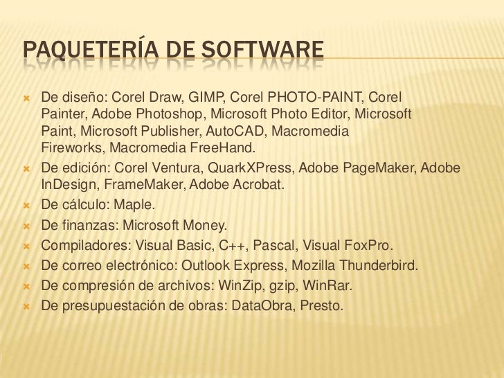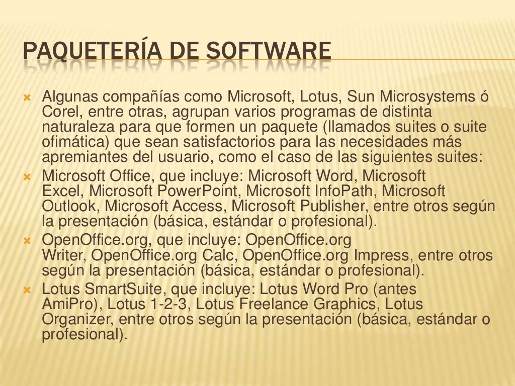 Un paquete de software es un conjunto de aplicaciones que se agrupan para formar un juego completo. Por ejemplo, Microsoft Office es un paquete de software que incluye aplicaciones de oficina como Microsoft Office Excel, Microsoft Office Word, Microsoft Office PowerPoint y Microsoft Office Access. Cada paquete incluye varios programas e información sobre la versión, instalación y uso.