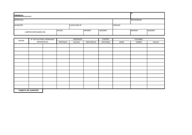 Ver todas las plantillas. El formato tarjeta Kardex en Excel, te permitirá administrar, monitorear y realizar seguimiento a la mercancía o productos de tu empresa, de manera fácil, clara y confiable. De manera totalmente gratuita podrás implementar un método de control de inventario de productos en el almacén de tu empresa.
