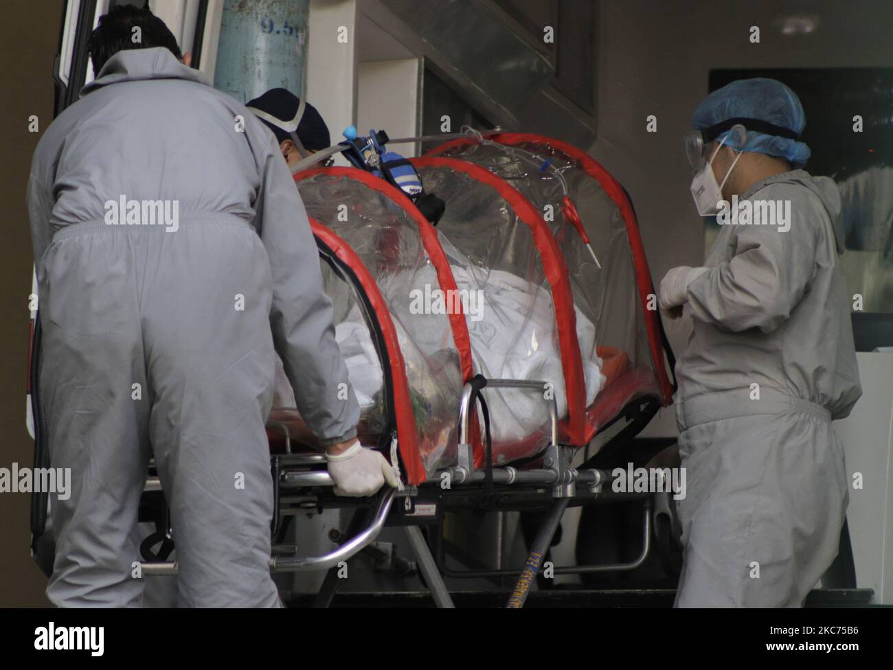 Personnel from an ambulance descend on a woman in a capsule with COVID19 symptoms to enter the